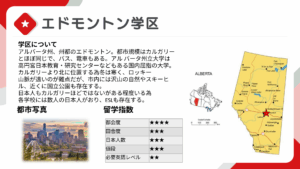 アルバータ州内ではカルガリー学区に続いて2番目に大きい学区。州都にあるので、エドモントンにはアルバータ大学もあり、学力の高い進学先があるのが魅力のひとつ。学校の規模も大きく、1,000人を超えている。電車やバスなどの交通も良く、留学生にとって快適に過ごせる。日本人留学生も少ない。都市型の留学を希望していて、日本人が少ないところがいい人には最適。